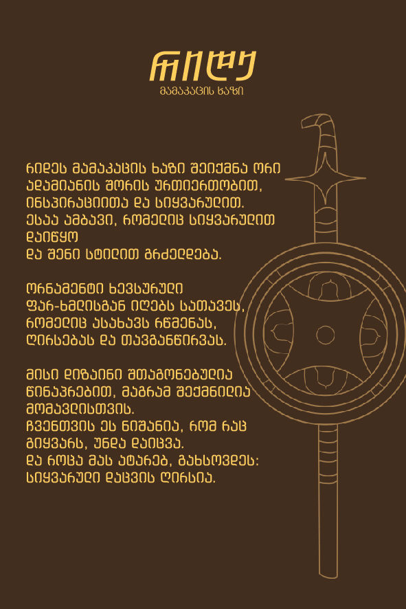 ორნამენტი ხევსურული ფარ-ხმლისგან იღებს სათავეს, რომელიც ასახავს რწმენას, ღირსებას და თავგანწირვას. მისი დიზაინი შთაგონებულია წინაპრებით, მაგრამ შექმნილია მომავლისთვის. ჩვენთვის ეს ნიშანია, რომ რაც გიყვარს, უნდა დაიცვა. და როცა მას ატარებ, გახსოვდეს: სიყვარული დაცვის ღირსია.
