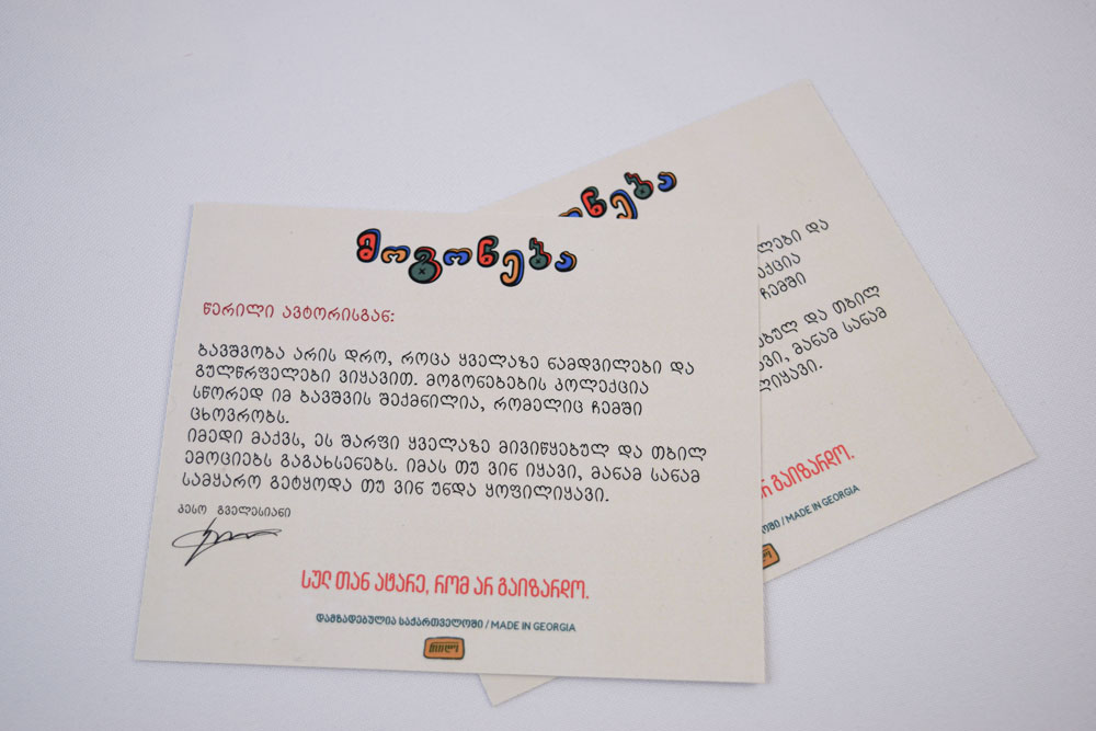 ბავშვობა არის დრო, როცა ყველაზე ნამდვილები და გულწრფელები ვიყავით. მოგონებების კოლექცია სწორედ იმ ბავშვის შექმნილია, რომელიც ჩემში ცხოვრობს.